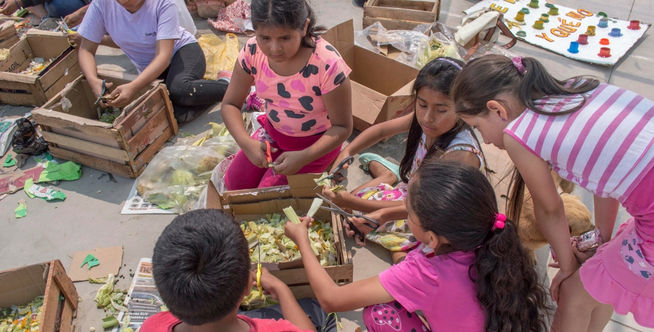 Entrega de los residuos orgánicos llevados por los estudiantes en el planchón de recepción.
